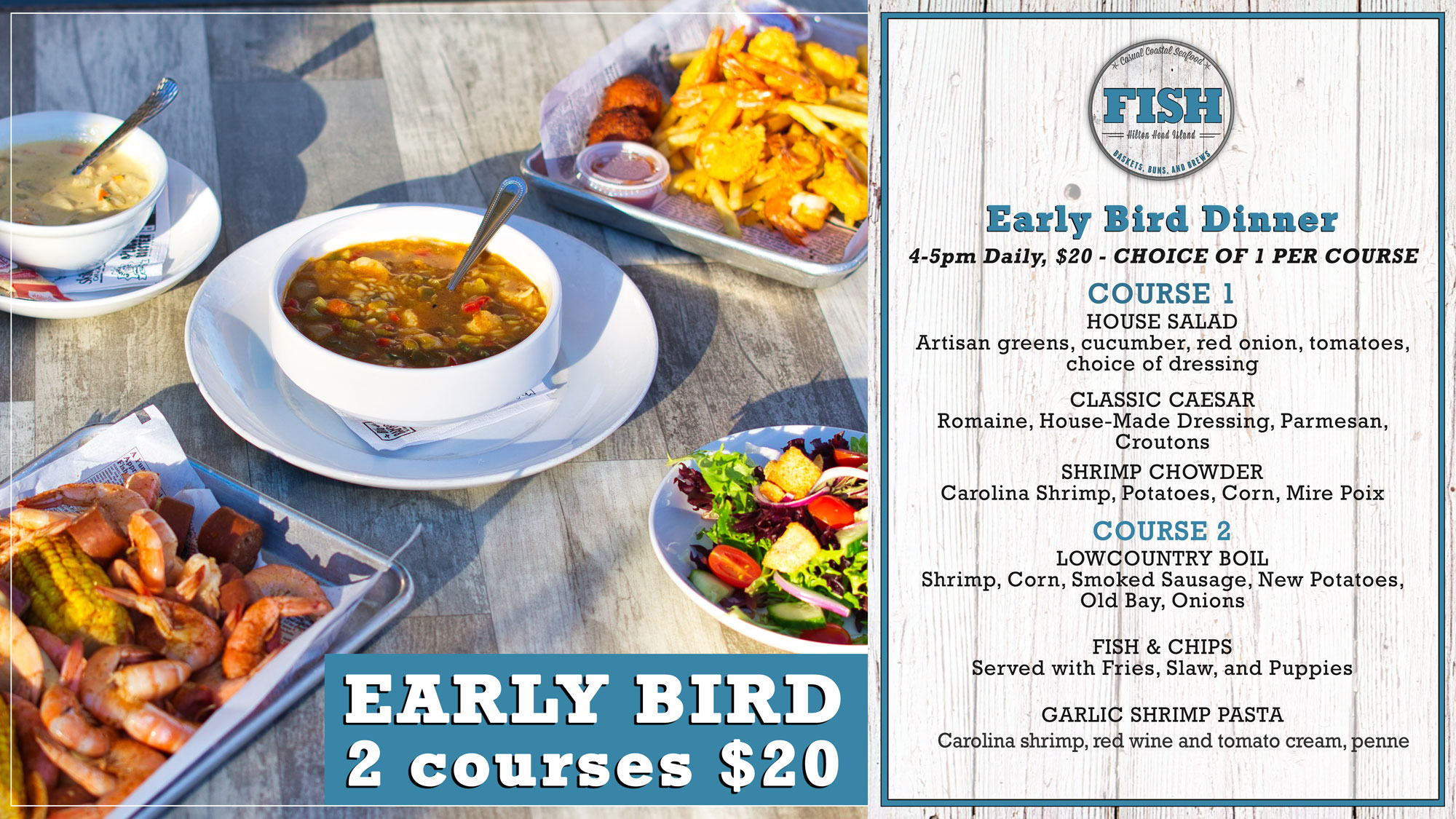 FISH is your Hilton Head home for fresh local seafood and family-friendly fun! Featuring free live music 7 days a week from locally loved artists, daily Happy Hour, All You Can Eat Crab Legs, and ample outdoor dining areas to enjoy the Lowcountry weather.
